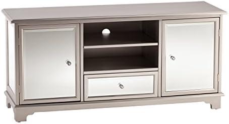 This glamorous media stand enhances any living room with its captivating design, featuring a silver painted finish, beveled mirror accents, and crystal-style knobs. It’s not just about aesthetics; the piece provides ample storage options, including a robust drawer, an open center area, and two cabinets—ideal for organizing everything from board games to electronic devices. Measuring 52″ W x 16.25″ D x 24.25″ H, it can hold flat panel TVs up to 50″ W, ensuring it meets both style and functionality in your entertainment space.