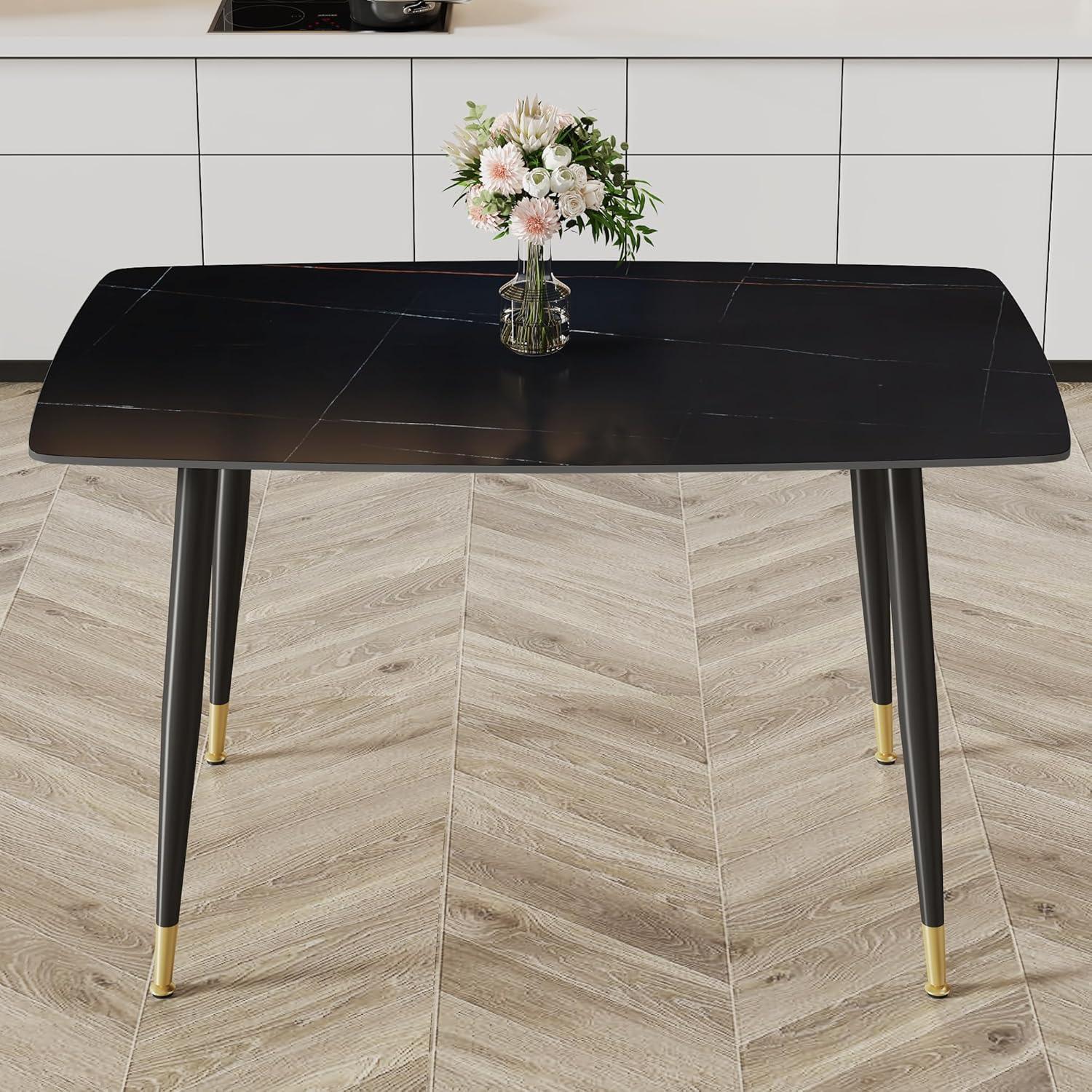 This dining table offers a stylish and contemporary design, featuring a sintered stone tabletop that is not only aesthetically pleasing but also exceptionally durable. The smooth surface is scratch-resistant, ensuring that it maintains its elegant appearance even with regular use. Its rectangular shape, measuring 48.4”x28”x30”, makes it an excellent fit for compact spaces such as apartments or dormitories, accommodating up to four people comfortably.The four metal legs provide sturdy support, with a maximum weight capacity of 300 pounds.The gold coating on the base of each leg adds a touch of sophistication, making it a chic addition to any dining space or restaurant.