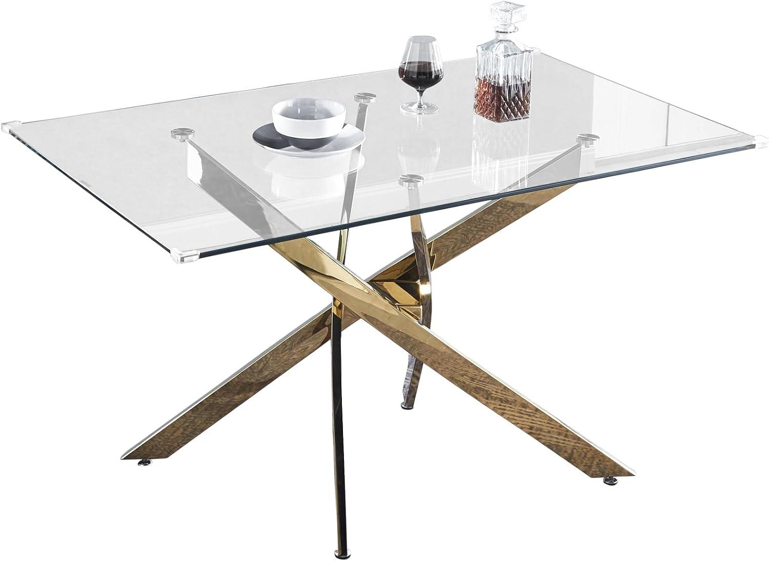 This contemporary dining solution boasts a robust tempered glass top, measuring 51.2 inches in length and 31.5 inches in width, making it an ideal choice for families or groups of friends. The glass surface is not only beautiful but also waterproof and simple to clean with a damp cloth,ensuring that spills and messes are easily managed. It can comfortably accommodate up to four people, making it perfect for intimate dinners or casual gatherings. With elegant golden legs and added anti-slip feet,this piece seamlessly fits into various settings,from dining rooms to cafes and patios.