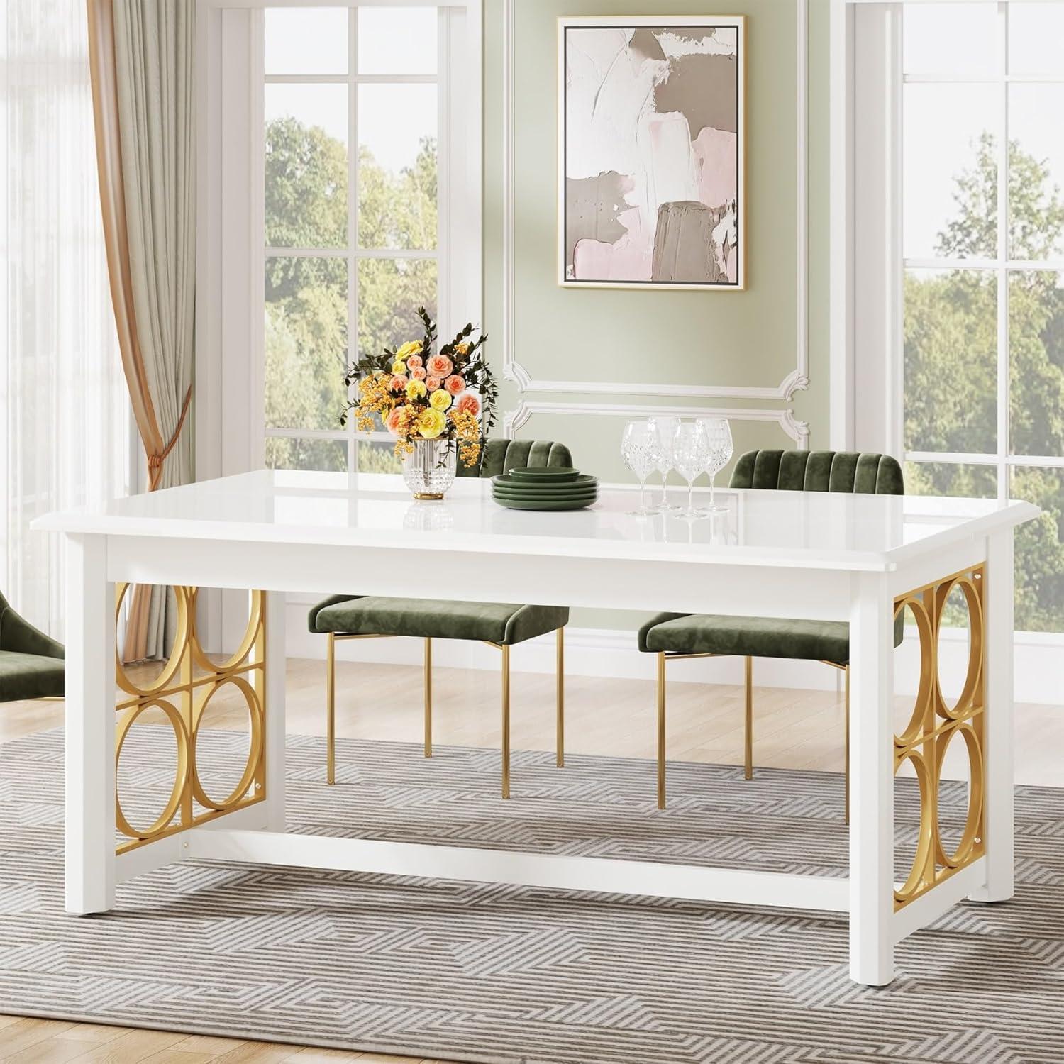 This elegantly designed table features a sleek white finish complemented by gold accents, making it a striking centerpiece for your dining or kitchen area. Measuring 63 inches in length and 31.5 inches in width, it comfortably accommodates 4 to 6 people, perfect for family gatherings or entertaining guests. the contemporary look, combined with its sturdy MDF construction, ensures that it isn’t just visually appealing but also durable and practical for daily use. Its rectangular shape allows for a spacious dining experience, while the modern design seamlessly integrates into various interior styles.