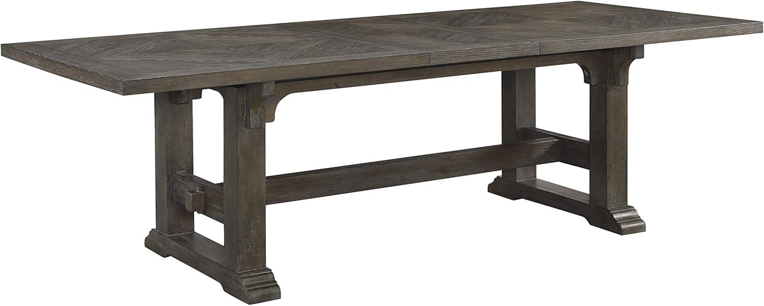 This dining table features a beatiful driftwood brown finish that complements a variety of home decors, especially those embracing a transitional aesthetic. The table is crafted from ash veneer, showcasing a stunning box diamond pattern that adds visual interest to any dining space. Its trestle base provides stability while maintaining a sleek design. A self-storing leaf allows the table to accommodate additional guests, extending its length by 18 inches, thus making it perfect for entertaining friends and family.