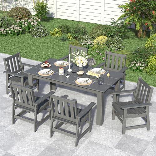 This patio dining set combines style and functionality, featuring a sturdy rectangle table and six comfortable chairs. The table is crafted from premium high-density polyethylene, ensuring low maintenance and the ability to withstand diverse weather conditions. Unlike traditional wood or metal, this material is resistant to cracking and burning, making it an ideal choice for outdoor use. The table’s wood grain design adds a classic touch, while the triangular legs provide enhanced stability. Additionally, it includes a 2″ umbrella hole, allowing for easy shading during sunny days.