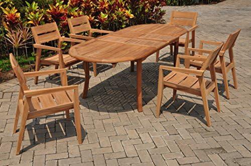 This elegant outdoor dining set features a 94″ double extension oval table complemented by six stacking arm chairs. The table is constructed from Grade-A kiln-dried teak wood, ensuring durability and resistance to weather-related wear. It includes a 2″ umbrella hole at the center, which can be covered with a wooden cap when not in use. The table’s design allows for easy storage as it folds up neatly like a book, while its dimensions make it suited for various outdoor spaces. The stainless steel hardware enhances the structural integrity of the pieces, making them a reliable choice for long-term outdoor use.