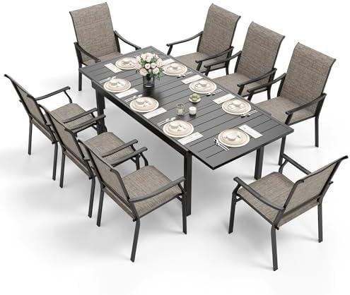 This outdoor dining set features eight quick-dry Textilene chairs designed to provide comfort and breathability, making them ideal for any weather conditions. Constructed with a sturdy, heavy-duty iron frame, the chairs ensure stability and durability while holding up to 350 lbs, accommodating guests of various sizes. The included expandable outdoor dining table, measuring 83 inches by 37 inches, offers ample space for dining and entertaining, enhancing any lawn, park, or courtyard setting. The set is designed for effortless setup, so you can enjoy your outdoor space in no time.