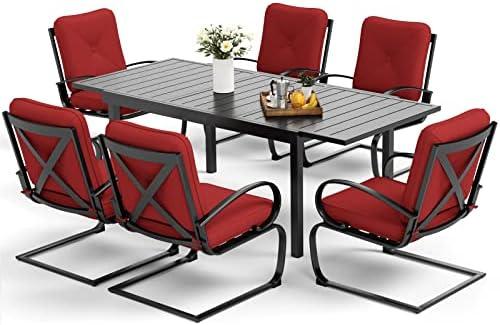 This outdoor dining set offers an elegant yet practical solution for your patio or garden dining needs. The expandable dining table features a metal slat tabletop and an E-coating frame, making it both durable and weather-resistant. In its compact state, it measures over 61 inches and extends to approximately 84 inches, catering comfortably to 7 to 9 people. With a weight capacity of 300 lbs per chair, the C-Spring motion design of the six chairs allows for a gentle rocking motion, enhancing your relaxation while enjoying outdoor meals. The deep-seat cushions add an extra layer of comfort, making it perfect for hosting family dinners or casual gatherings with friends.