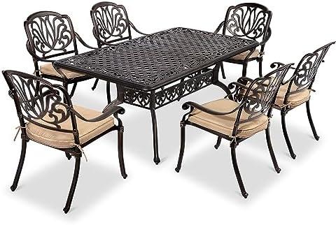 This beautiful dining set, crafted from high-quality cast aluminum, offers a perfect blend of aesthetics and functionality. It includes six ergonomic chairs with khaki cushions designed for maximum comfort, featuring supportive backrests and convenient armrests. The spacious rectangular dining table comes equipped with a 2-inch diameter umbrella hole, making it easy to integrate shade for those sunny days. The stackable design of the chairs allows for effortless storage, ensuring that you can maintain your outdoor space uncluttered and inviting.