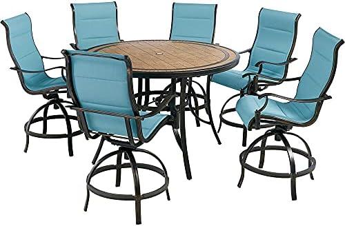 This high-dining set is designed to elevate your outdoor dining experience with its sleek and stylish features. It includes six comfortable sling-back swivel chairs, each allowing for a smooth 360-degree spin, paired with a 56-inch round tile-top table, making it perfect for both intimate dinners and larger gatherings. The combination of heavy-duty aluminum frames and elegant cast details not only ensures durability but also adds visual appeal. The padded sling fabric offers both comfort and support, making it a great choice for spending extended periods outdoors while enjoying meals with family and friends.