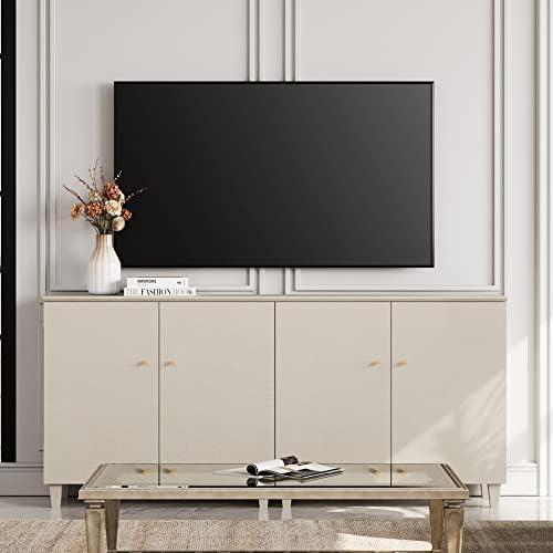 This versatile entertainment center boasts a unique faux linen-textured finish that adds a modern touch to any living room or bedroom. Designed to accommodate flat screens up to 75 inches, it features two cabinets and six storage compartments, providing ample space for DVDs, game boxes, and decorative items. The elegant gold knobs and the sturdy construction with solid wood legs not only ensure durability but also create an eye-catching focal point in your home. The configuration allows for separate use as a buffet table, coffee bar, or sideboard, enhancing its functionality across different settings.