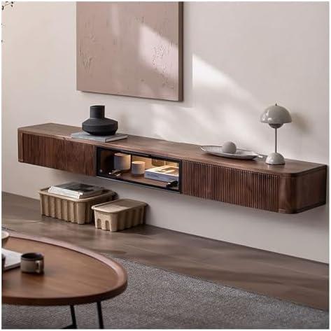 The wall-mounted design of this sleek media console maximizes upper space while creating a chic and contemporary atmosphere in both bedrooms and living rooms. Constructed from premium black walnut wood, this floating TV cabinet not only emphasizes style but also ensures durability and functionality with its sturdy structure. The clever cable management system, featuring built-in holes for wire concealment, helps maintain an organized and tidy appearance, perfect for showcasing your electronics while keeping messy cords at bay. Additionally, this versatile piece can accommodate various items, from cable boxes to decorative ornaments, making it a focal point in your decor.