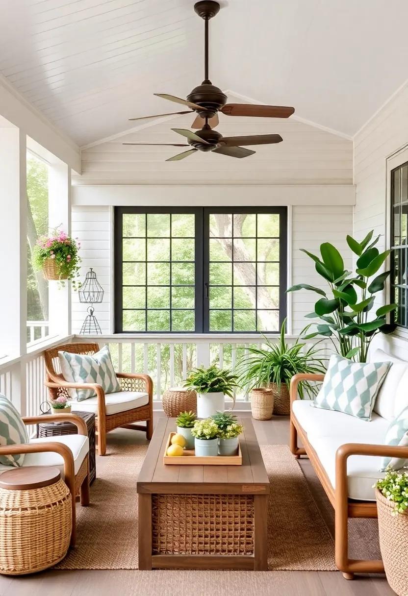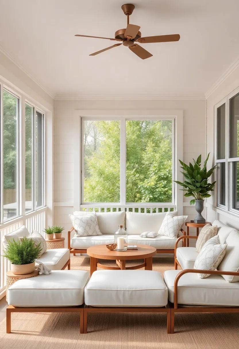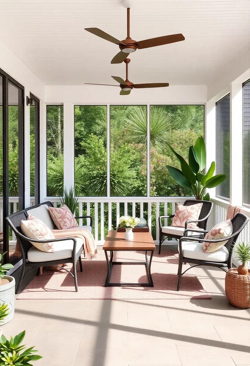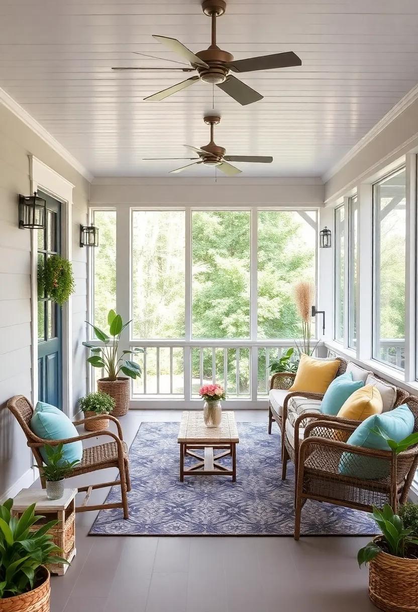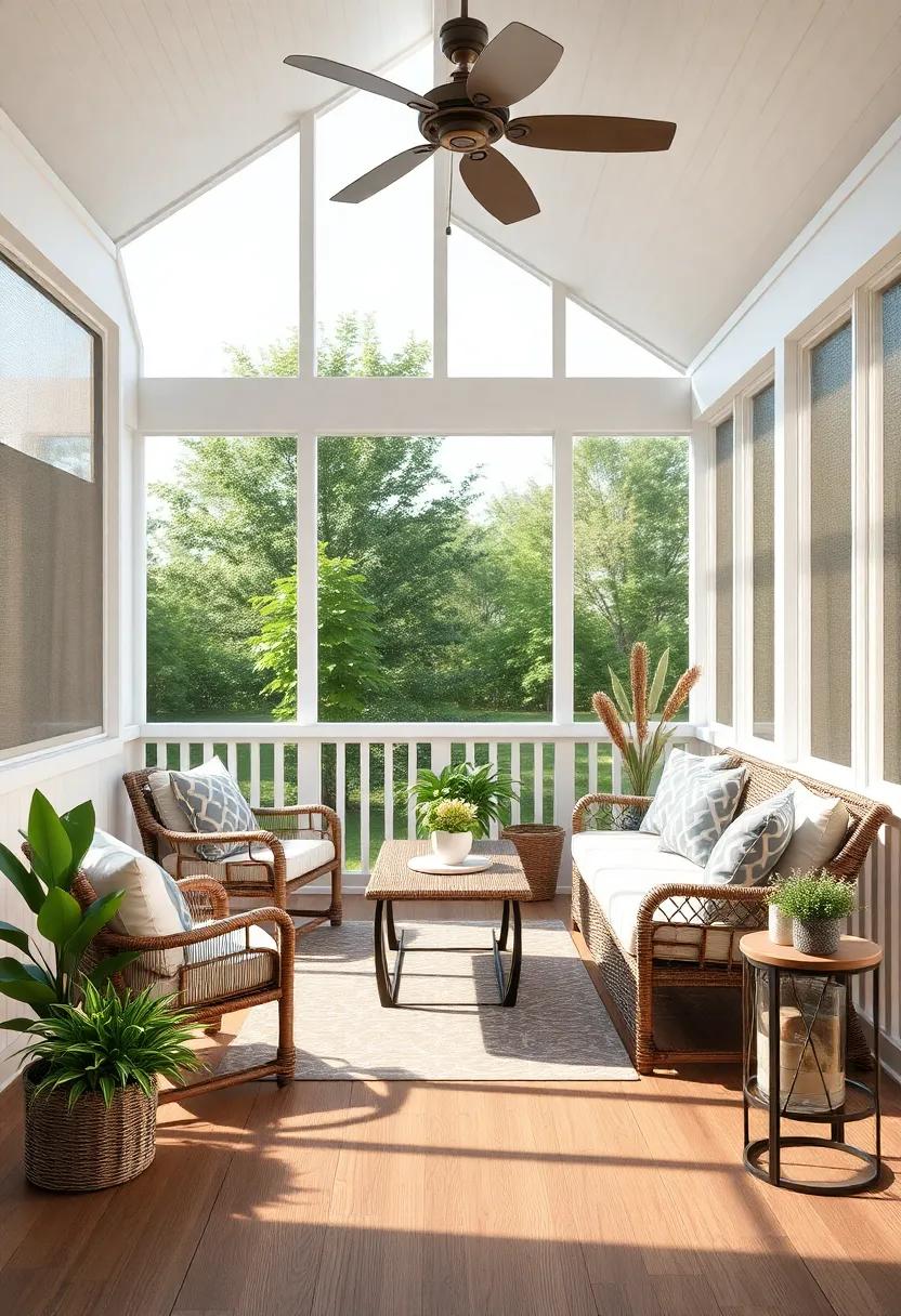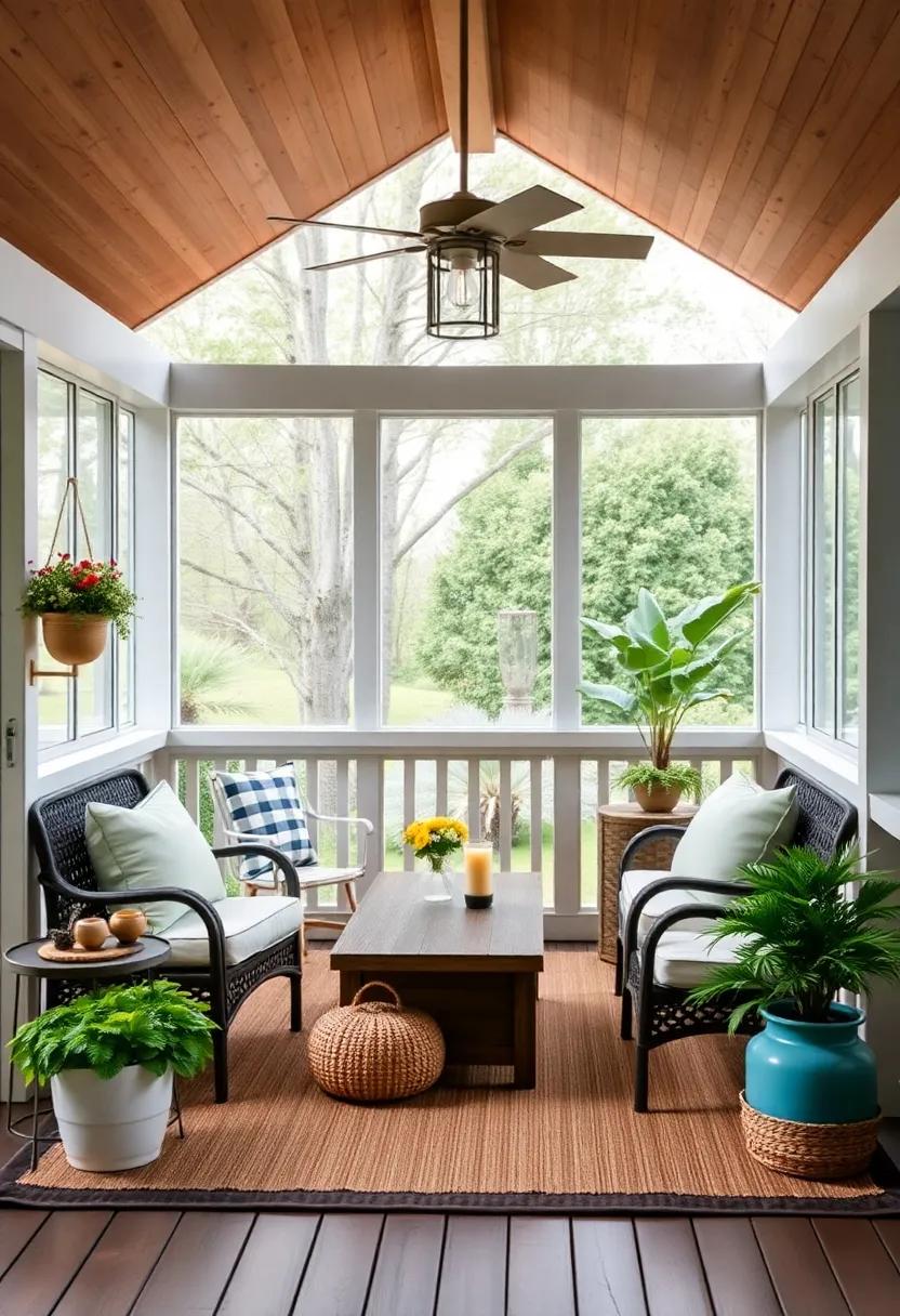 In winter, transform the space into a cozy retreat by layering textures. Add a faux fur or wool throw and replace the floral decor with evergreen accents—think garlands or small potted trees for a touch of nature. Incorporate warm lighting with string lights or lanterns to create a serene ambiance. Give a nod to spring with pastel accent pieces, such as lightweight curtains that allow sunlight to filter in, bringing a fresh feel even during the colder months.Use a rotating display of seasonal artwork—think nature prints or abstract pieces reflecting the colors of each season—to keep your screened porch feeling lively and inviting.