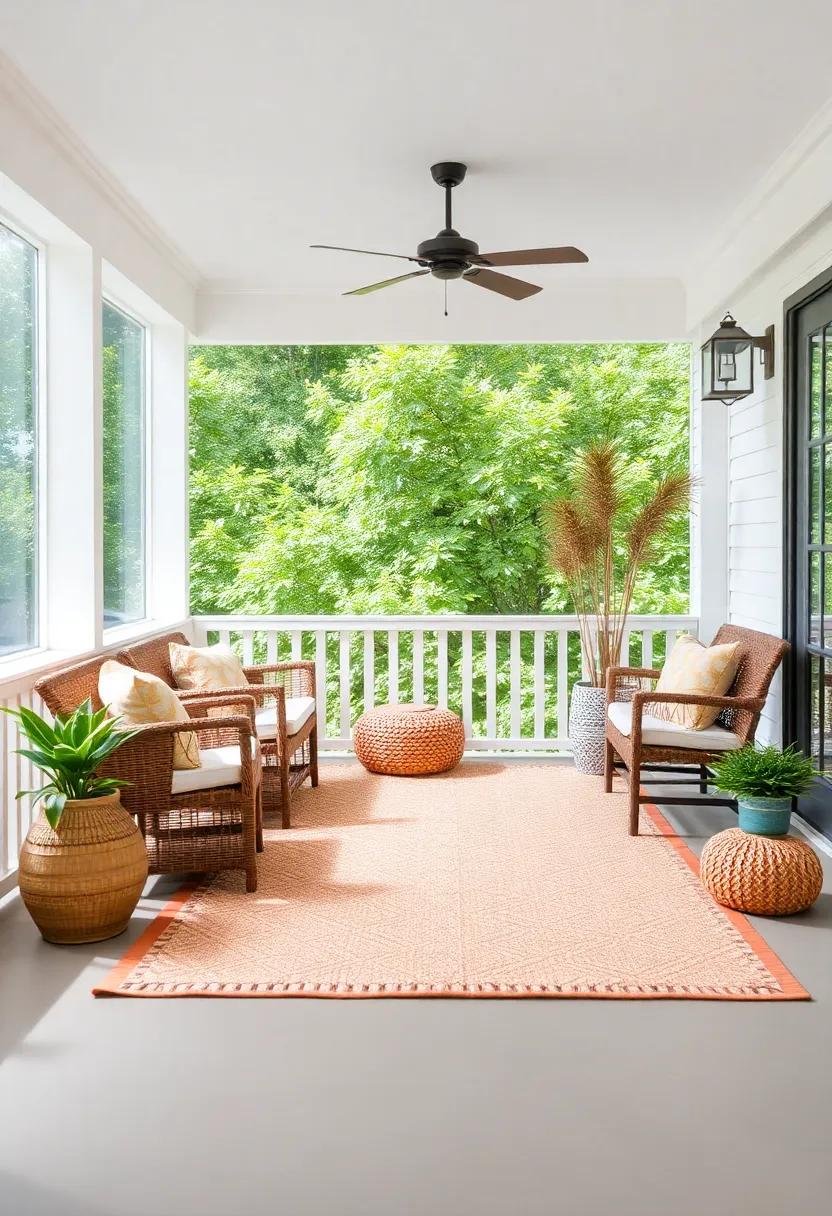 Incorporating natural materials can further enhance the cozy feel of your hideaway. Think about adorning your porch with woven rugs, wooden furniture, and soft, patterned cushions. These elements can be complemented by carefully positioned planters, which can act as visual barriers while enriching the air quality. For added functionality, a simple, elegant table can serve as a spot for your coffee or books. To help organize your ideas, here’s a quick reference table with suggestions for the decor: