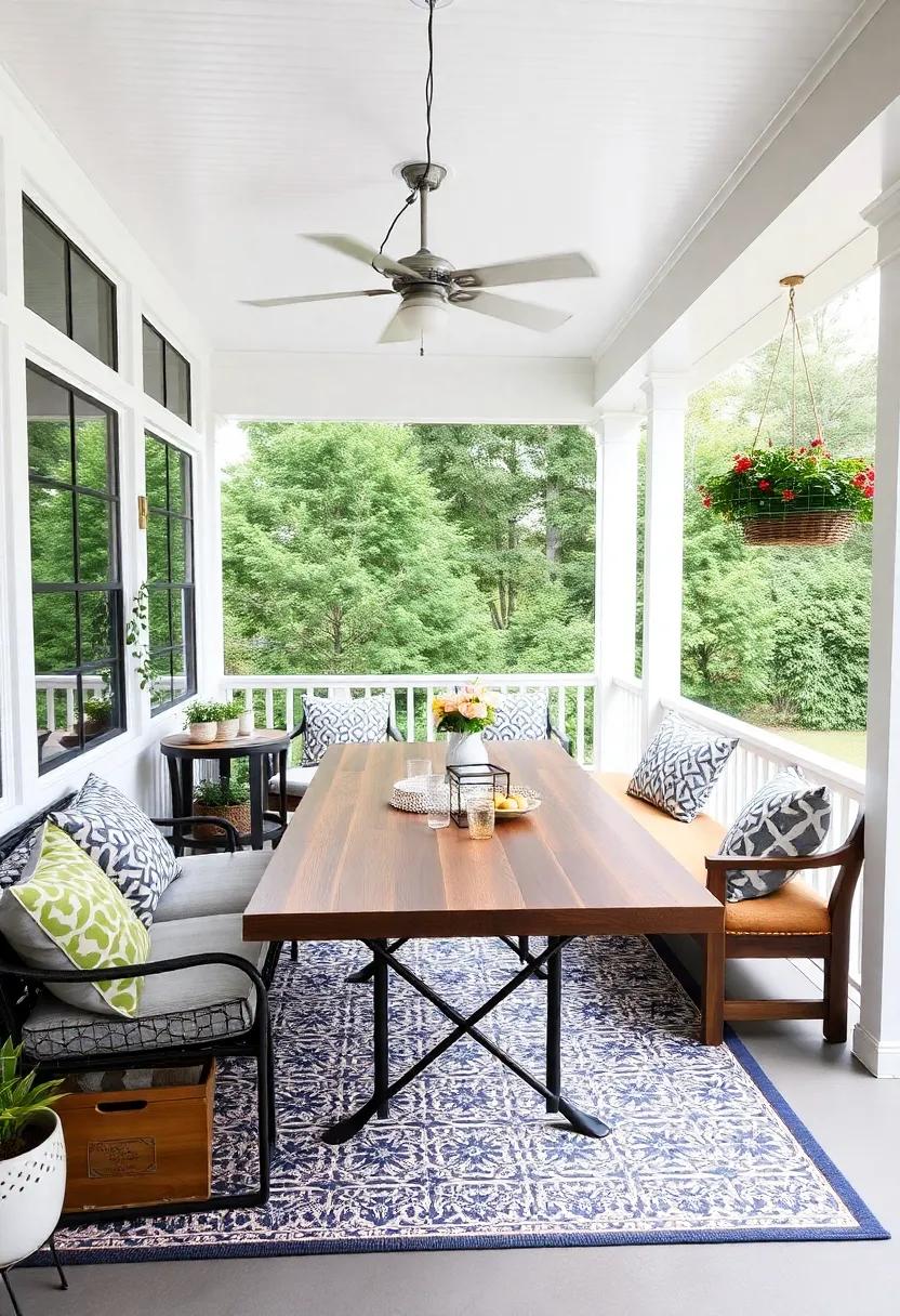 To enhance the dining experience, choose rugs that complement your built-in benches and dining table.When styling your porch, keep these tips in mind: