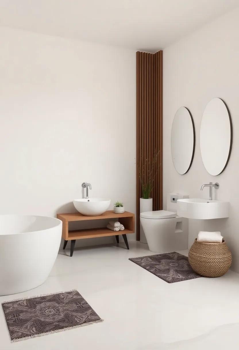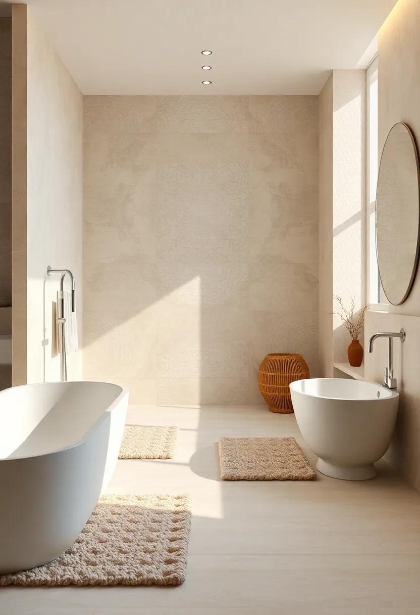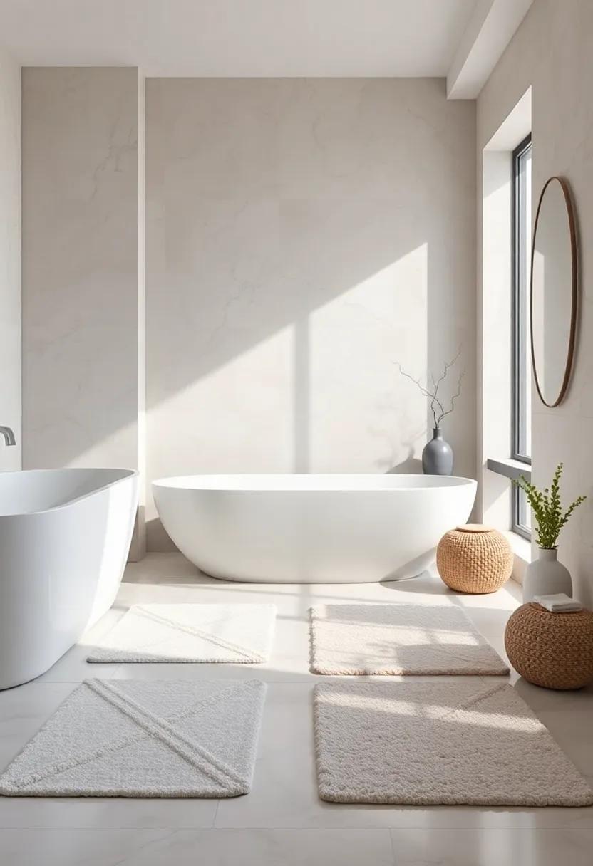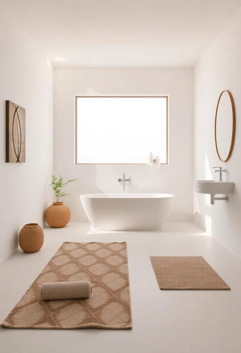 In a Zen bathroom, the essence of tranquility can be accentuated through the thoughtful placement of rugs and mats. By incorporating textured materials and soft colors, you can delineate various areas, promoting a sense of calm and purpose. Here are some ways to effectively use rugs to create distinct zones:
