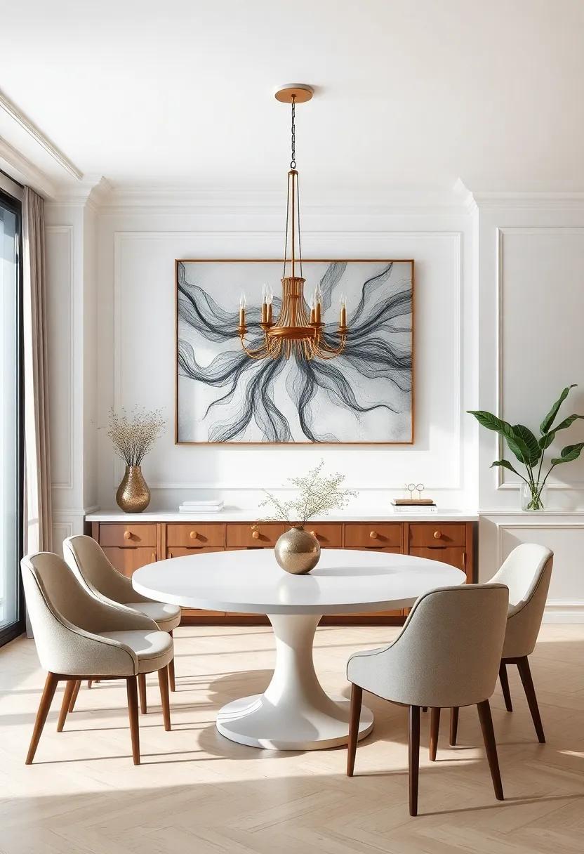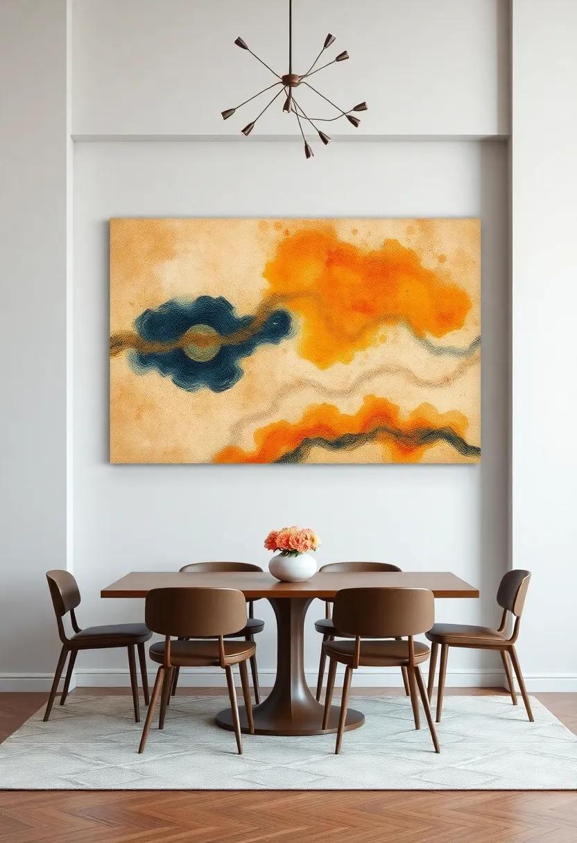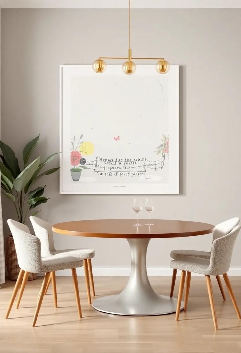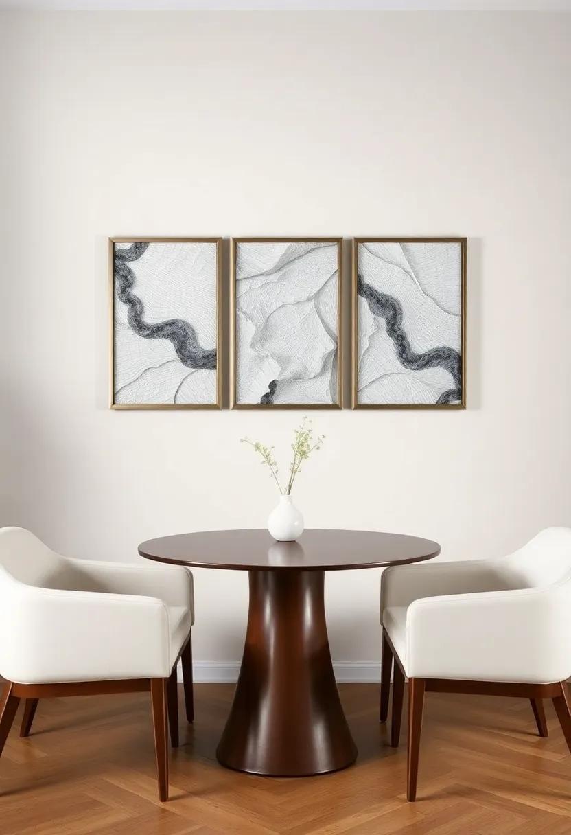 In addition to a gallery wall, think about incorporating a statement piece that commands attention. A large canvas featuring an eye-catching design or an elegant oversized mirror can serve as both an artful display and a functional element within the space. For dimension, introduce texture through three-dimensional artworks, such as sculptural wall hangings or wall-mounted ceramics.Don’t shy away from utilizing mixed materials—such as metal, wood, and fabric—to create a visual contrast that adds character. Remember to balance these artistic expressions with your dining table and seating, ensuring that the overall aesthetic is one of sophistication and warmth.