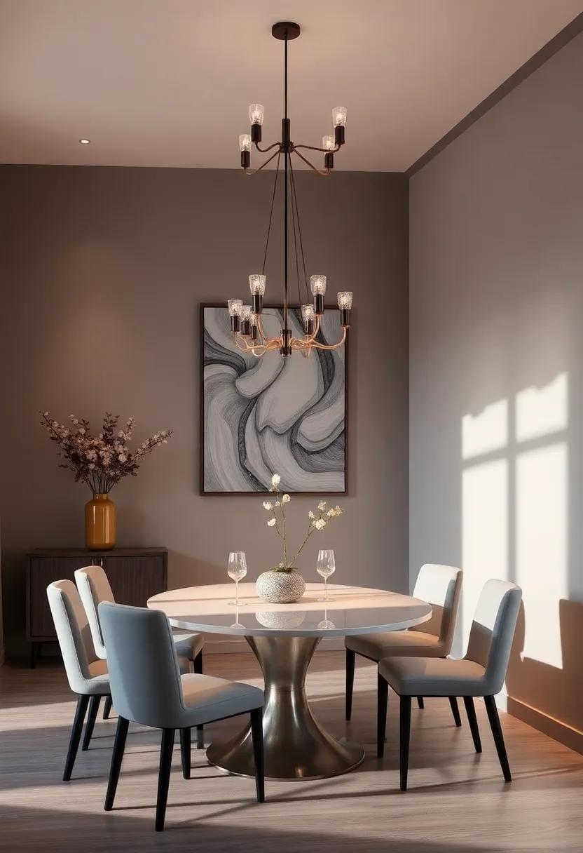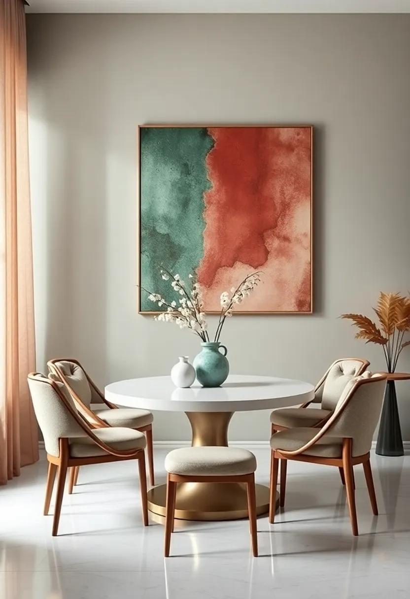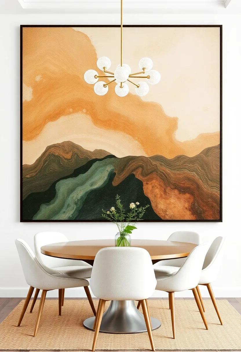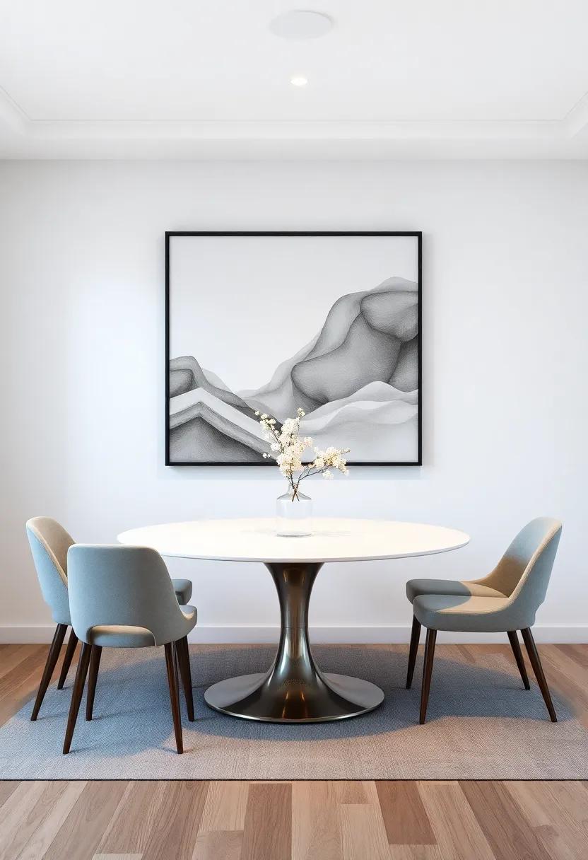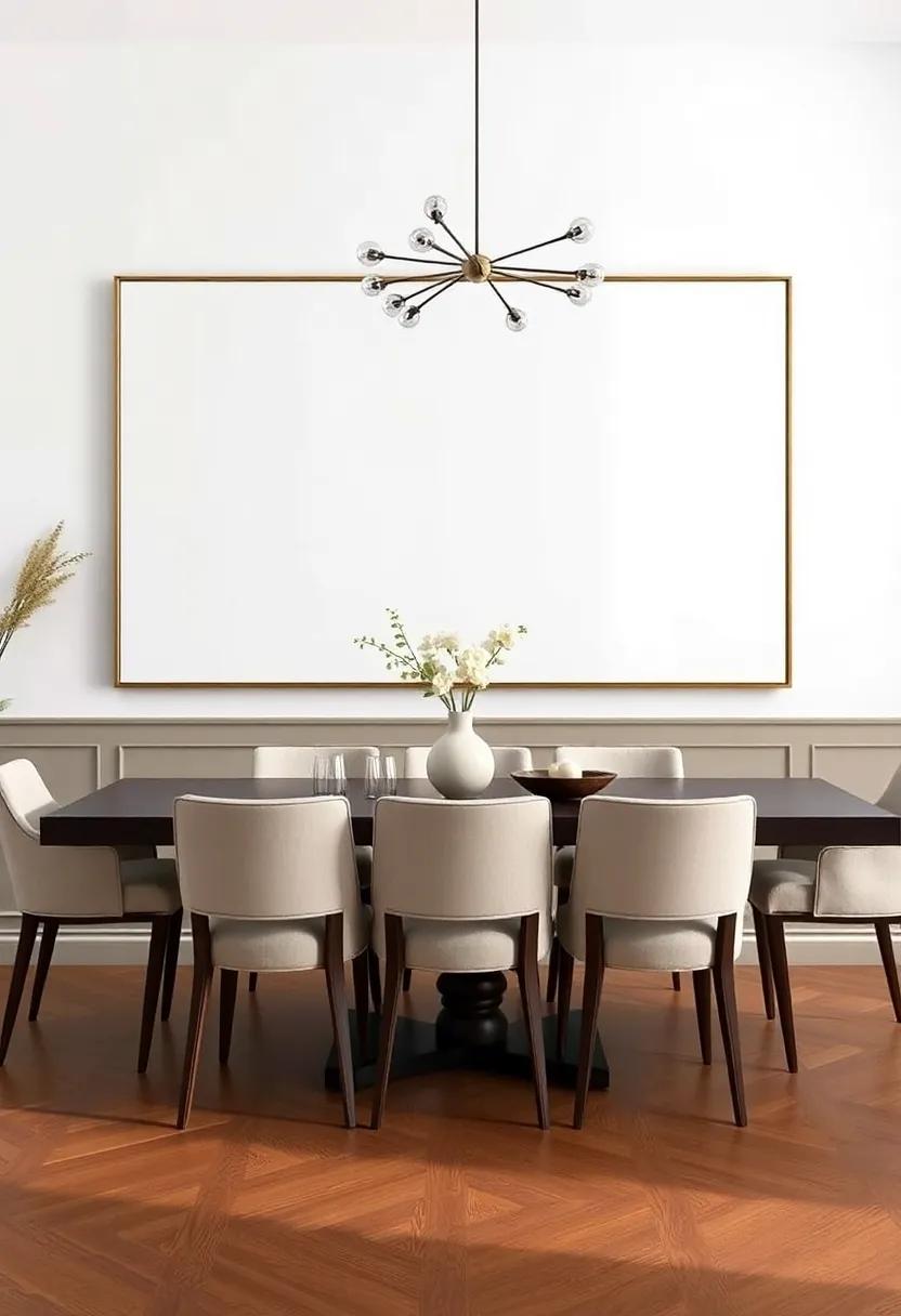In addition to a gallery wall, think about incorporating a statement piece that commands attention. A large canvas featuring an eye-catching design or an elegant oversized mirror can serve as both an artful display and a functional element within the space. For dimension, introduce texture through three-dimensional artworks, such as sculptural wall hangings or wall-mounted ceramics.Don’t shy away from utilizing mixed materials—such as metal, wood, and fabric—to create a visual contrast that adds character. Remember to balance these artistic expressions with your dining table and seating, ensuring that the overall aesthetic is one of sophistication and warmth.