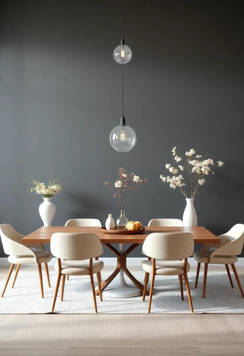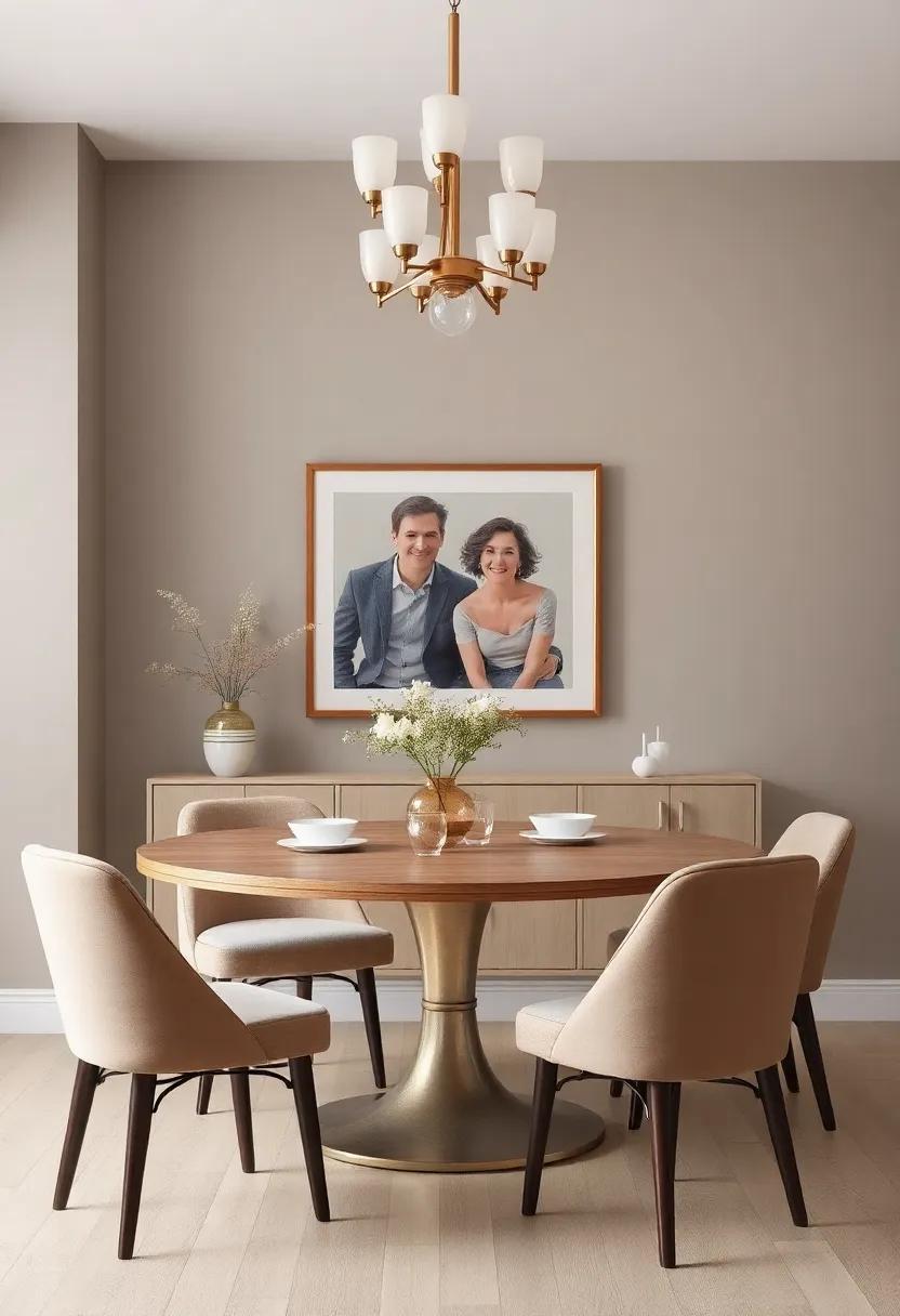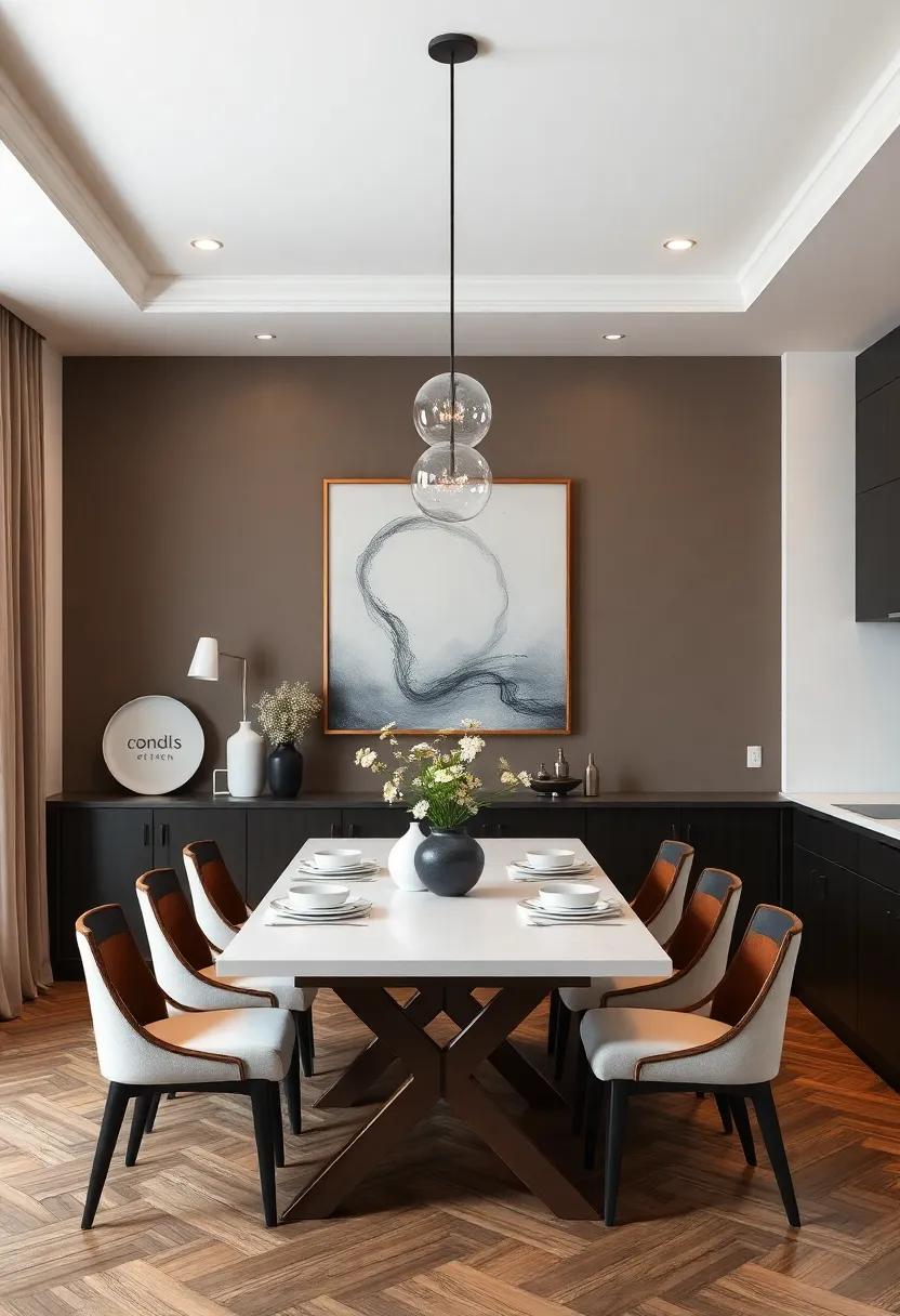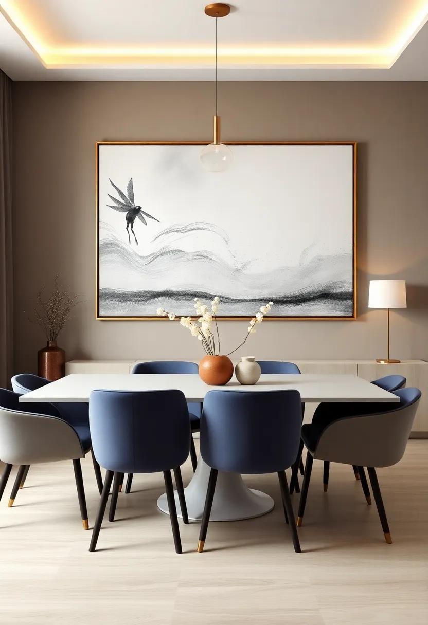 In addition to a gallery wall, think about incorporating a statement piece that commands attention. A large canvas featuring an eye-catching design or an elegant oversized mirror can serve as both an artful display and a functional element within the space. For dimension, introduce texture through three-dimensional artworks, such as sculptural wall hangings or wall-mounted ceramics.Don’t shy away from utilizing mixed materials—such as metal, wood, and fabric—to create a visual contrast that adds character. Remember to balance these artistic expressions with your dining table and seating, ensuring that the overall aesthetic is one of sophistication and warmth.