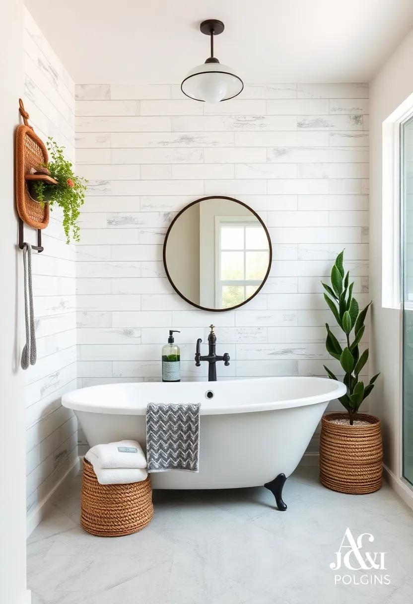 The mix of square patterns against softer textures, like fluffy towels or a woven basket, softens the look while reinforcing the farmhouse theme. By thoughtfully integrating these elements, your bathroom may not only reflect a love for tradition but also provide a cozy, inviting atmosphere that feels timeless.