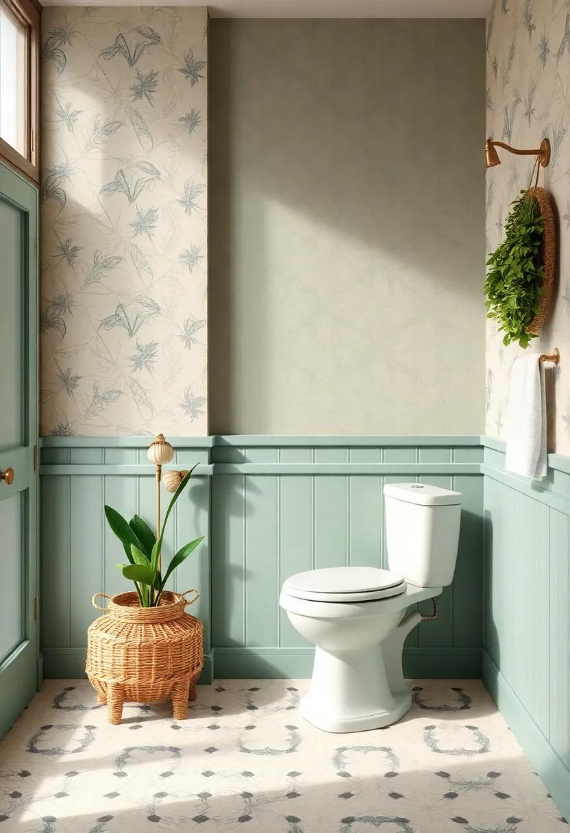 These accents create a cohesive look that harmonizes with the wallpaper while introducing warmth and comfort. Additionally, utilizing a color palette that emphasizes these soft tones will ensure a seamless transition throughout the space, turning your bathroom into a serene retreat with a touch of farmhouse elegance.