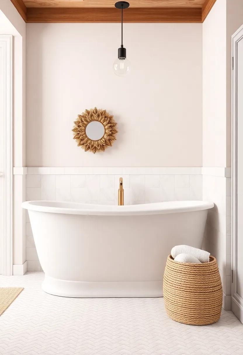 To enhance the farmhouse charm in your bathroom, consider incorporating accessories that complement the soft palette. Look for items such as: