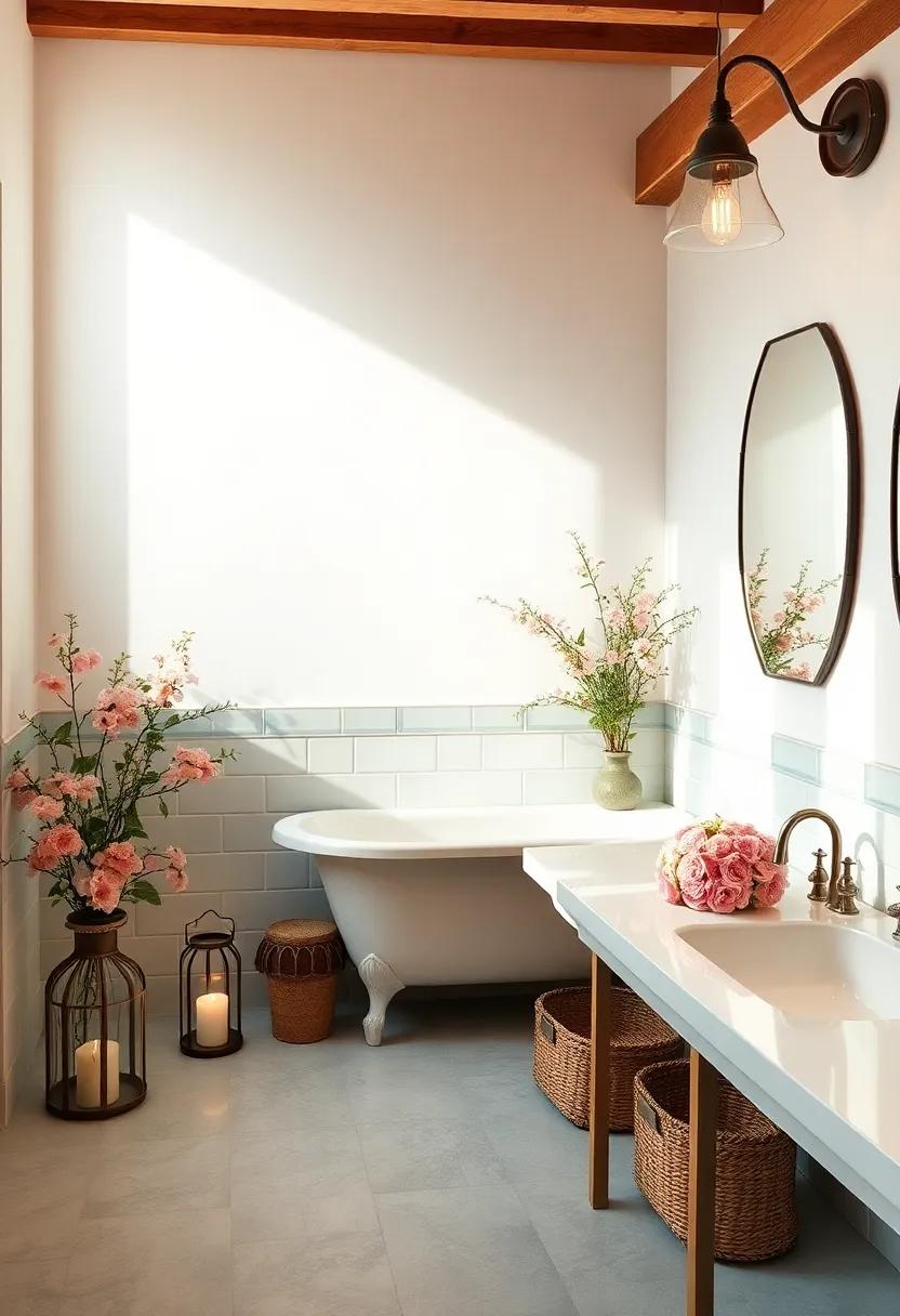 Incorporating vintage lanterns into your bathroom design can instantly elevate the ambiance, adding a touch of rustic charm that perfectly complements farmhouse style. Consider hanging a few weathered lanterns at varying heights to create an inviting glow during evening hours. You might also place smaller lanterns on shelves or countertops,filling them with battery-operated candles or fairy lights for a magical effect. Accessorizing with floral accents—such as delicate faux blooms in soft pastels—can enhance the warmth and serenity of the space. Arrange flowers in vintage mason jars or simple ceramic vases to effortlessly blend functionality with beauty.