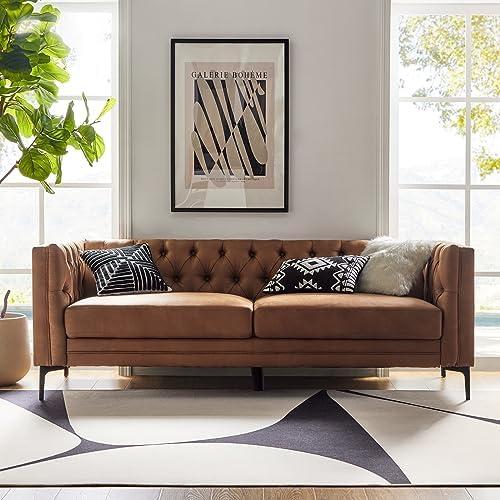 This faux leather sofa combines quality materials with a chic mid-century modern design, offering both elegance and practicality. Its smooth, skin-friendly leather is easy to maintain—stains can be simply wiped off with a damp cloth, making it a hassle-free option for busy households. The sofa’s button-tufted design and unique square armrests enhance its visual appeal, seamlessly fitting into a variety of living spaces. With generous dimensions of 84″ wide, it comfortably accommodates three people, making it an excellent choice for gatherings or lounging.