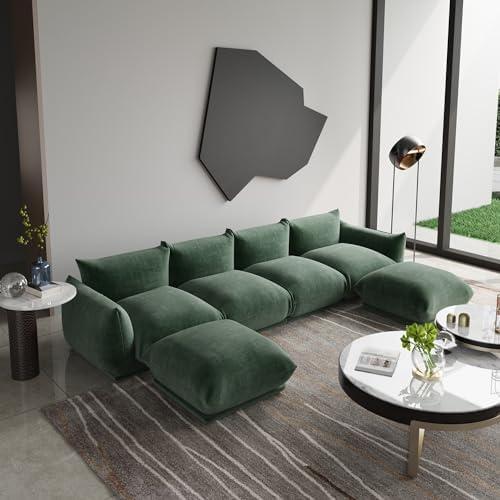 This sectional couch boasts plush comfort combined with a clean-lined, modern design that makes it an attractive centerpiece in any living room, office, or apartment. Upholstered in performance velvet, it features solid wood construction with foam padding, providing a luxurious “sink-in” feel. The sectionals include reversible ottomans that can be arranged as footstools or chaise lounges, offering versatility for various spaces and personal preferences. With ample room for up to six people, this spacious sofa is well-suited for family gatherings or entertaining guests, effortlessly blending functionality with contemporary style.