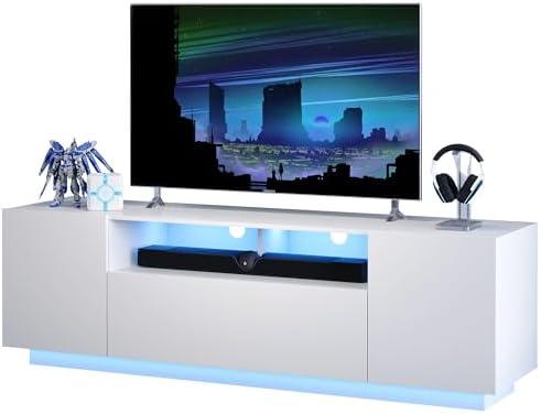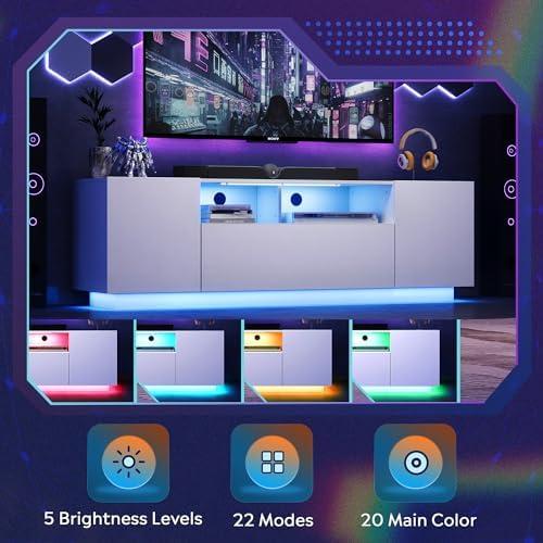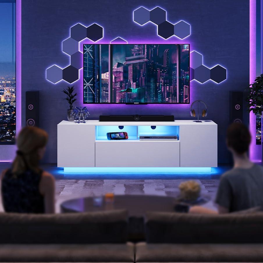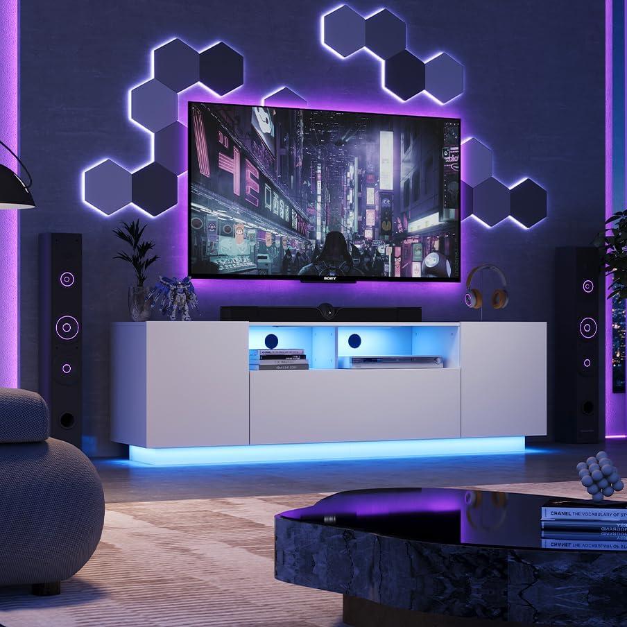 Functionality meets style with this sleek design, which not only hosts our large TV securely but also enhances the ambiance of our living space. The generous hidden storage options keep our room clutter-free, with three compartments and an open drawer that perfectly accommodate all our media essentials. Plus, the built-in LED lighting offers a dynamic atmosphere, allowing us to choose from 20 different colors to match our mood. This combination of aesthetic and practicality truly elevates our home decor, bringing a modern minimalist vibe that we adore.