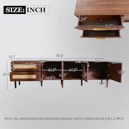 The rattan TV stand brings a delightful modern touch to our living room, seamlessly combining style and functionality. Measuring 70.8” L x 15.7” W x 19.6” H, it comfortably accommodates TVs up to 80”, becoming the centerpiece of our entertainment area. We appreciate the spacious storage options it offers, including two drawers and three cabinets, which effectively organize all our media essentials, gaming consoles, and DVDs. The natural rattan accents not only add an air of sophistication but also merge beautifully with our existing décor, whether we lean towards modern or Bohemian styles. Additionally, the cable management system helps us keep unsightly wires out of view, enhancing the sleek aesthetic of our space.