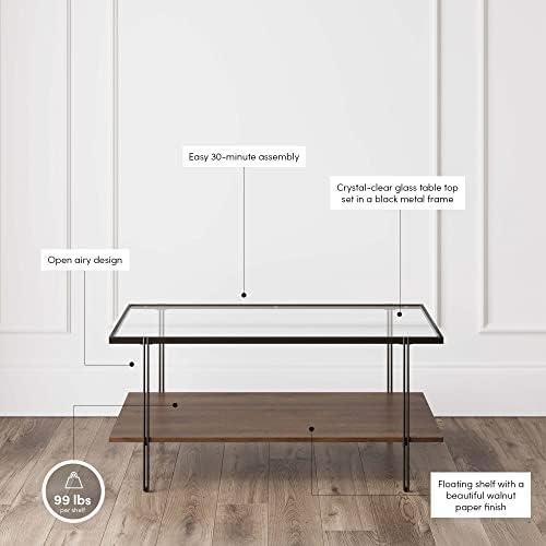 We have discovered the perfect blend of materials in this eye-catching coffee table. The sleek, crystal-clear glass top not only adds an airy touch to our living area but also creates a sophisticated aesthetic. The warm walnut finish on the lower shelf introduces a cozy element, beautifully contrasting with the slim matte black legs. This combination enhances both the modern and industrial vibe, making it a focal point in any room. With its straightforward design and clean lines, it balances elegance with practicality, giving us the versatility to showcase decorative items while providing ample storage for magazines and snacks.