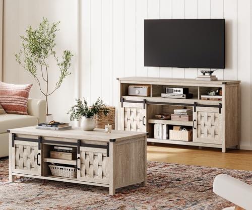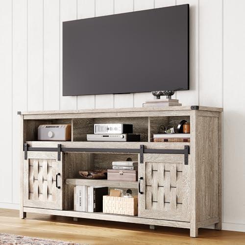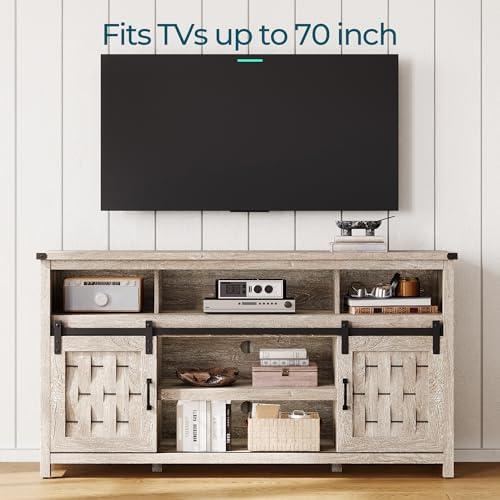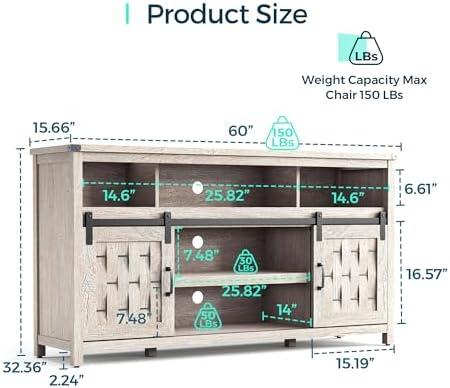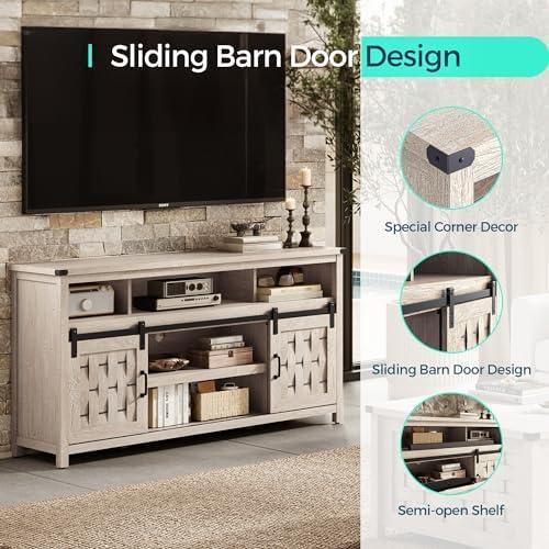We appreciate the blend of style and functionality this entertainment center brings to our living room. Its farmhouse-inspired design showcases unique woven patterns, a rustic wood grain finish, and tasteful iron-colored metal accents. Not only does it enhance the aesthetic appeal of our space, but it also serves as a compelling focal point that complements our décor. With a generous 60-inch wide tabletop, it perfectly accommodates our 65-inch TV while providing an open shelf above for our soundbar or gaming console. The integration of sliding barn doors adds a touch of charm and practical access, allowing us to tidy up and store items effortlessly.
