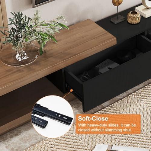 The modular design of this extendable entertainment center allows us to adapt and modify our storage requirements effortlessly. Featuring three spacious pull-out drawers and an extendable shelf, we can keep our essentials neatly organized while ensuring easy access. This versatile layout is perfect for stashing away our media devices, DVDs, remote controls, and other living room accessories, all while maintaining an elegant and clutter-free appearance. The smooth, soft-close mechanism on the drawers prevents any slamming, which enhances our experience of using the unit day-to-day.