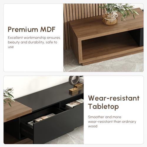 Unboxing the TV stand revealed a sleek, minimalist design that immediately caught our eye. The blend of black and walnut finishes adds a touch of elegance, making it a great addition to any living room decor. As we laid out all the parts, we were pleased to find that the high-quality MDF material felt sturdy and well-made, promising durability for long-term use. The dimensions are impressive, offering a width range of 70.5″ to 100.4″ when fully extended, making it ideal for larger TVs. The clean lines and modern silhouette definitely elevate the overall aesthetic of our space.