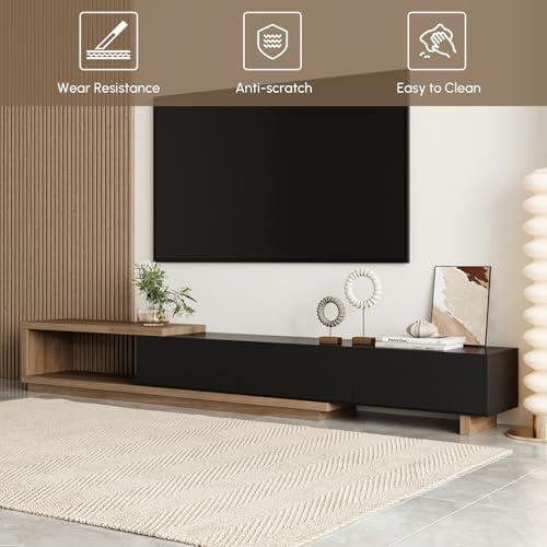 Our experience with the extendable TV stand has been nothing short of impressive. The sleek, minimalist design not only enhances the aesthetics of our living room but also aligns flawlessly with various interior styles. The stand accommodates televisions ranging from 70 to 79 inches, making it suitable for diverse setups. With dimensions that extend from 70.5″ to 100.4″, we appreciate the flexibility it offers; we can easily adjust its size according to our space needs. Additionally, it boasts a smooth, wear-resistant tabletop, ensuring that our television and decorative items are displayed in style without the worry of scratches or damage.