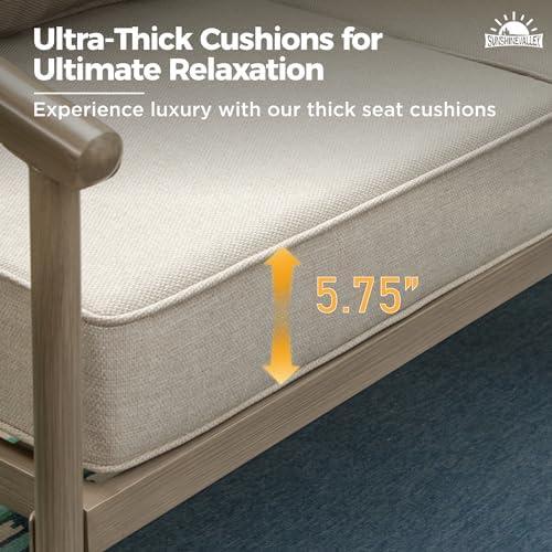 Comfort is paramount, and we can certainly rave about the 5.75″ thick cushions filled with high-density foam that promise a relaxing experience, whether we’re lounging alone or hosting friends. Moreover, the construction features a heavy-duty wrought iron frame that’s all-weather resistant, ensuring longevity and durability. The dual rust prevention techniques mean we can enjoy our time outdoors without worrying about maintenance. With easy assembly instructions included, transforming our outdoor space becomes a breeze! Don’t let this exquisite addition pass us by; let’s enhance our outdoor living with this stunning set. Explore Now