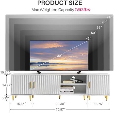 Our experience with this TV stand has been nothing short of impressive. Constructed from high-quality materials with durable particleboard and medium-density fiberboard, it effectively combines an elegant aesthetic with a sturdy framework. The versatility of this piece is particularly noteworthy, as it accommodates TVs ranging from 32 to 80 inches, making it suitable for various room sizes and layouts. The modular storage system provides ample space, with design elements such as sliding doors and adjustable shelves that cater to our storage needs, while also adding a stylish touch to our entertainment area.