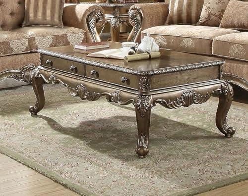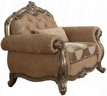 In examining the harmonious design of the chair alongside the coffee table, we find that both pieces brilliantly complement each other while showcasing their individual charm. The chair, with its rolled armrests, button-tufted back, and intricate scrolled-floral molding, offers a vintage elegance that resonates beautifully with the coffee table’s vintage oak finish and scrolled apron design. The chair not only serves as a comfortable seating option but also acts as a stylish accent, contributing to an overall formal atmosphere. The assortment of accent pillows included adds a layer of warmth, making the seating area inviting and stylish.
