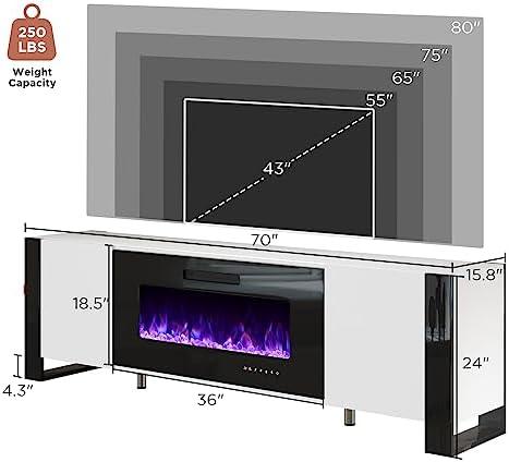 We were pleasantly surprised by the overall experience this product delivers. The modern high gloss finish combined with the unique U-shaped legs not only adds a touch of elegance to our living room but also ensures stability for televisions up to 80 inches. The warmth of the 36-inch fireplace with its realistic flame effects creates an inviting ambiance, particularly with its eight adjustable flame colors and five brightness settings. We appreciated the efficient 4800 BTU output, which not only keeps us cozy but can also be used independently from the heating function, serving as a stunning decor piece all year round.