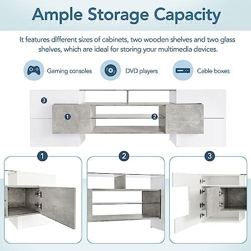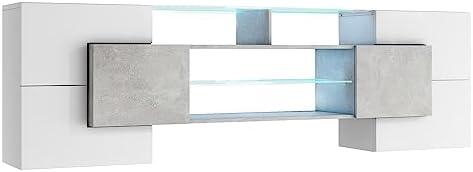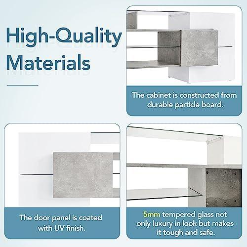 Our experience with the modern television stand has been quite positive. The ample storage capacity truly stands out, with a combination of wooden shelves and glass shelving that makes organizing our multimedia devices a breeze. We appreciate the distinct design featuring a high gloss finish, which adds an elegant touch to our living space. The clean lines and unique shape perfectly complement our contemporary decor and create a visually appealing focal point in the room. The high-quality materials used in its construction, including durable particle board and toughened glass, give us confidence in its longevity and stability.