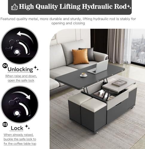 Our small living area has been completely transformed since we introduced this innovative coffee table into our home. Its design excels in space efficiency, featuring a lift-top that easily adjusts to create a versatile workspace or dining area. When fully lifted, it accommodates more people, offering a cozy spot to enjoy meals or work on our projects. Moreover, the integrated hidden storage compartment allows us to neatly tuck away items, which significantly declutters our space. The inclusion of four stools that fit seamlessly underneath the table keeps everything organized and adds even more storage capability. The stools are not only comfortable but also designed for easy cleaning, making them perfect for our busy lifestyle.