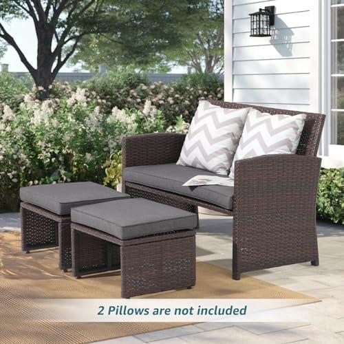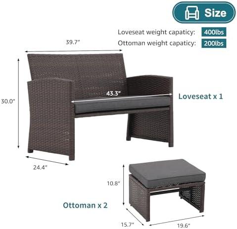 We spent several delightful afternoons enjoying our outdoor space with this chic patio set. The modern design and brown wicker complement our garden beautifully, while the dark grey cushions provide not just comfort but an inviting look. With measurements that fit snugly in smaller areas, the loveseat and ottomans allow us to arrange our seating for perfect conversations or peaceful relaxation. Each piece feels sturdy and has been effortlessly standing up to the elements thanks to the UV-protected wicker and durable steel frame.