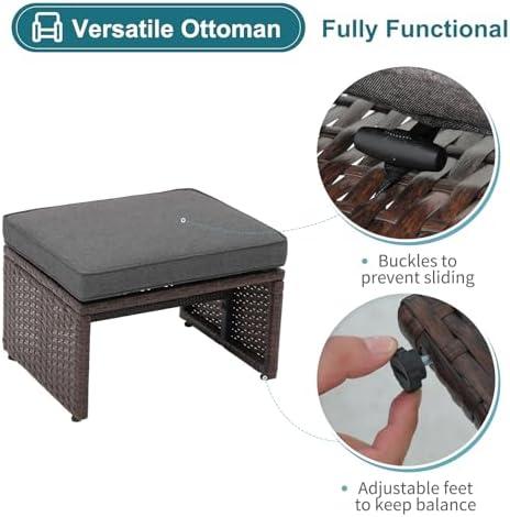 Our outdoor experience has been elevated by the deeply cushioned seats, which feature thick sponges for maximum comfort. We were particularly impressed by the horn button on the ottoman that keeps cushions securely in place, making it an excellent spot for propping our feet up or for an extra seat when guests arrive. The adjustable feet of the ottoman come in handy for maintaining balance on uneven surfaces. We appreciate that the easy-to-clean cushion covers zip off, ensuring our set stays looking fresh. Learning about its versatility—acting as both a seat and a side table—makes it a standout piece for gatherings. Discover what it can bring to your outdoor moments as well! Shop Now