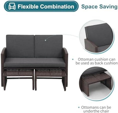 We appreciate the versatility that this outdoor set brings to our patio experience. The ottoman doubles as not just a footrest but also serves as an additional seating option or a coffee table, making it a great multifunctional piece. Its sleek design allows us to store it conveniently under the loveseat when not in use, freeing up space and keeping our area tidy. Furthermore, the cushion can easily switch roles, transforming from a footrest cushion to a back cushion, which is a thoughtful feature that enhances our comfort while relaxing outdoors.