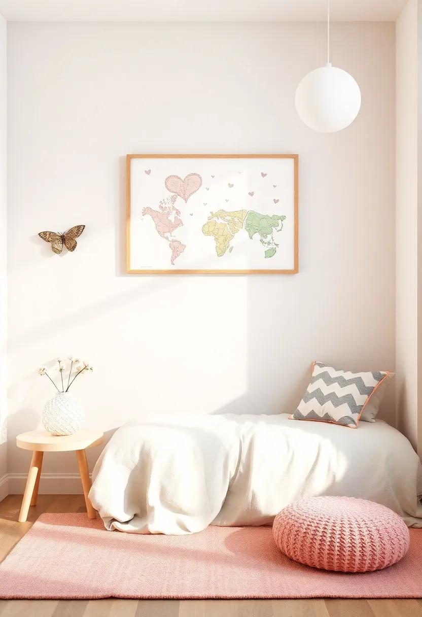 To enhance the charm of the room, think about integrating three-dimensional pieces that add depth. Hanging paper lanterns or origami stars can transform the ceiling into a dreamscape, while whimsical shelves shaped like clouds or trees offer both storage and an imaginative display for treasures. Create a cozy reading nook with a mural that invites storytelling adventures, and include comfortable cushions for all-day relaxation. To keep it engaging, consider a rotation system for art pieces, allowing your child to curate their environment and express their individuality. Utilize interactive installations, such as a chalkboard wall for creative doodles, to stimulate artistic expression at any moment!