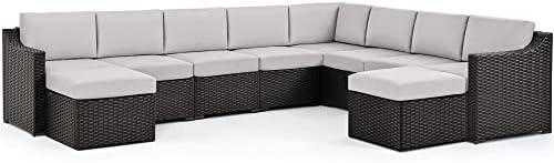 This remarkable outdoor furniture collection showcases a modular design, allowing for endless configuration possibilities to suit your space. Whether hosting friends or enjoying a quiet afternoon, you can easily transform the ottoman into a coffee table or rearrange individual pieces. The four-inch thick cushions are not only plush but also designed with ergonomics in mind, offering superb back support and comfort. Each cushion comes with a zippered cover, making it effortless to clean and maintain over time. Constructed from weather-resistant PE rattan and a powder-coated, rust-resistant steel frame, this set ensures both durability and style in your outdoor area.