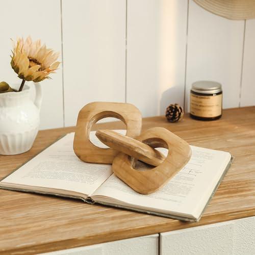 Crafted with precision, this distinctive wood decor piece features three elegant chain links made from solid wood. Measuring 8.5 inches long and 4 inches wide, its sturdy construction ensures that it not only adds aesthetic value but serves as an eye-catching conversation starter. The handcrafted design beautifully merges natural elements with a contemporary aesthetic, making it the perfect addition to a variety of home decor styles, including modern farmhouse, bohemian, and traditional designs. Its versatility allows it to shine as a centerpiece on coffee tables, entryway tables, or bookshelves, enhancing the overall atmosphere of any living space.