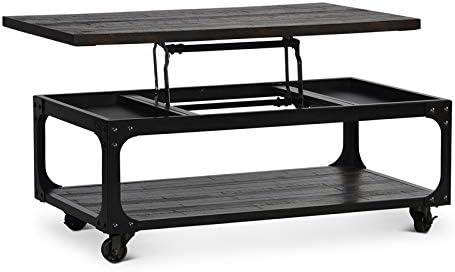 This hardwood coffee table features a rustic distressed tobacco finish that enhances any living space with a touch of warmth and sophistication. The combination of hardwood solids and an iron-framed base ensures durability while offering a stylish aesthetic. Its innovative design includes a spring lift top for smooth, controlled opening and closing, making it a practical addition to any room. The integrated casters provide effortless mobility, allowing you to rearrange your space with ease. Additionally, the bottom shelf serves as a perfect spot for added storage or decorative accents, making this piece both functional and visually appealing.