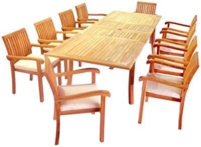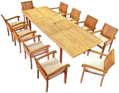 When considering whether this dining set is a worthy addition to our outdoor space, several factors stand out. The combination of a 117″ double-extension rectangle table and 10 stacking arm chairs presents an impressive blend of functionality and elegance. The ability to extend the table to accommodate gatherings or family meals cannot be understated. Additionally, the inclusion of a 2″ hole for an umbrella ensures that we can enjoy shade during sunny days, and the wooden lid covers that hole seamlessly when not in use. The craftsmanship is notable as well; made from select kiln-dried teakwood and strengthened with stainless steel connections, this set promises durability and longevity.