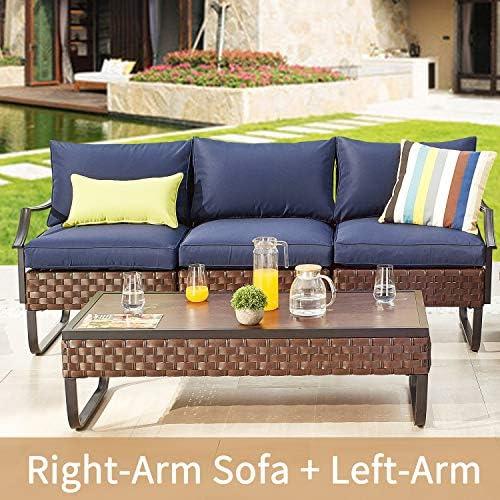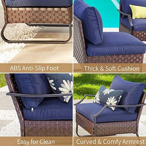 When we first settled onto the soft cushions of this outdoor furniture set, we immediately noticed the striking comfort it offered. The luxurious, thick cushions—featuring a 5.1-inch thickness for the seats and 4.7 inches for the back—perfectly cradled our bodies, providing a cozy spot to relax. These cushions are filled with water-resistant mixed cotton, ensuring not only durability but also that they maintain their shape over time. What we found truly impressive was the clever design that keeps the seat cushions securely in place, allowing us to lounge without constantly readjusting. Plus, the stain-resistant blue color adds both flair and practicality, making maintenance a breeze.