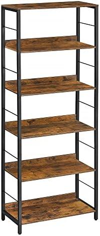 This versatile shelving unit features six spacious shelves, perfect for displaying books, decorative items, or even kitchen essentials. Constructed from quality particleboard and sturdy steel, it can support up to 82 lbs per shelf, making it an excellent choice for heavy items. The protective back panels keep your belongings secure while the crossbars on the side serve a dual purpose as bookends and hanging rails for frequently used items. Its rustic brown and black color scheme adds an industrial charm that can enhance the aesthetic of any room, from a living room to a home office.