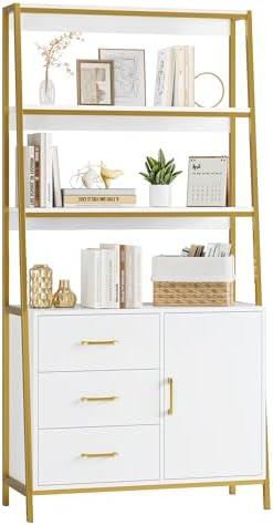 This versatile storage solution is designed to accommodate a variety of settings, whether you need extra space for file storage in your home office, an attractive display for your kitchen appliances, or a stylish entryway organizer. The modern industrial style, characterized by its unique combination of a golden metal frame and wooden shelves, adds elegance and charm to any room. The spacious 4-tier design allows you to showcase your favorite books, plants, and decor, while three wooden drawers and a door cabinet keep your belongings neatly tucked away, minimizing clutter and maintaining a harmonious living space.